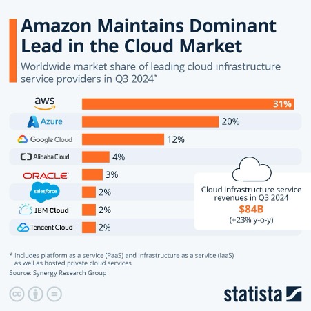 The core of AWS is its foundational Infrastructure-as-a-Service (IaaS) components, which entail Amazon EC2 for computing resources, Amazon S3 for scalable storage, and Amazon RDS for managed databases. With over 108 availability zones spread across 34 geographical regions, AWS has diversified its global presence: holding a notable 31% share of the global cloud computing market, it remains a reliable provider.